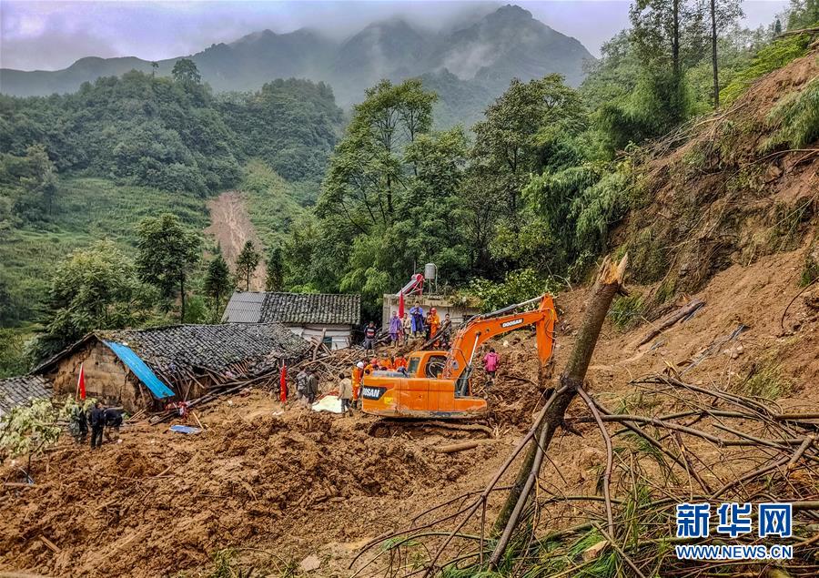 9月5日,救援人员在现场搜救。 记者从云南省昭通市巧家县人民政府新闻办公室获悉,9月5日凌晨4时40分许,受强降雨影响,巧家县小河镇马鞍村烂泥箐村民小组发生滑坡自然灾害,导致2户9人失联。 新华社发(胡华伦摄)
