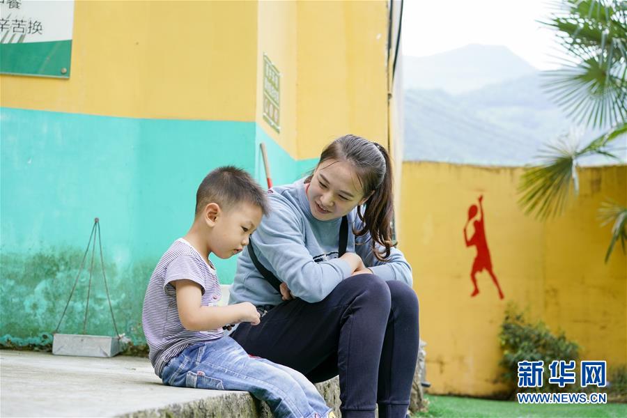 9月3日,在莲花小学,穆翼和幼儿班的小男孩谈心。 新华社记者 刘潺 摄