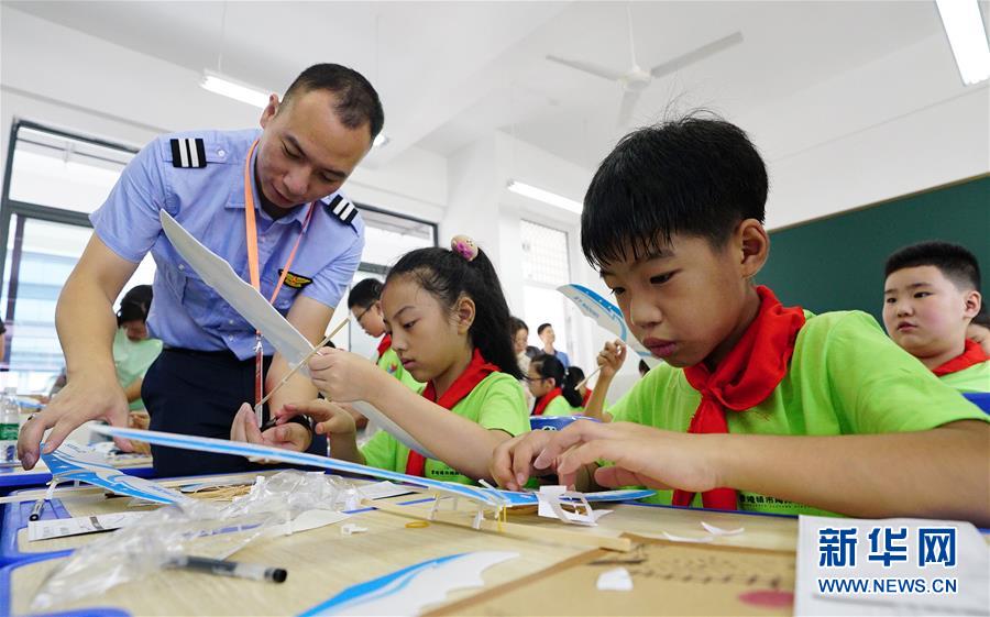 9月5日,在江西省景德镇市陶阳学校四年级的课堂上,飞行员和学生一起制作航模。 新学期伊始,江西省景德镇市陶阳学校开展“让梦想起航 航空知识进校园”主题活动,邀请国内外的飞行员走进校园,和学生分享飞行经历与故事,并一起动手制作航模。 新华社记者 彭昭之 摄