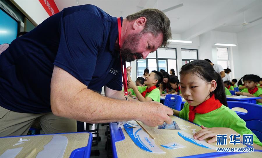 9月5日,在江西省景德镇市陶阳学校四年级的课堂上,来自美国的飞行员和学生一起制作航模。 新学期伊始,江西省景德镇市陶阳学校开展“让梦想起航 航空知识进校园”主题活动,邀请国内外的飞行员走进校园,和学生分享飞行经历与故事,并一起动手制作航模。 新华社记者 彭昭之 摄