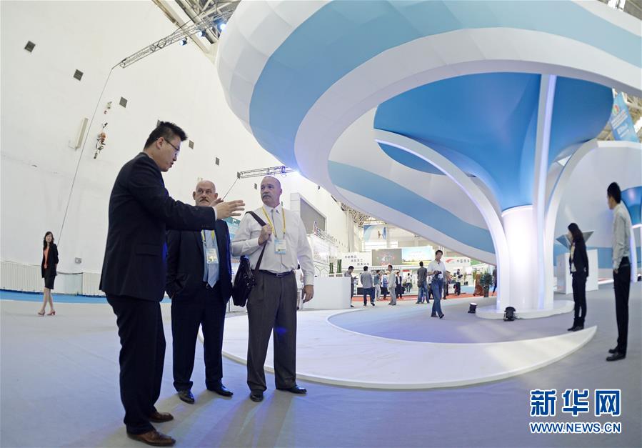 2013年9月17日,参展商在首届中阿博览会宁夏哈纳斯新能源控股集团展位参观。 新华社记者 王鹏 摄