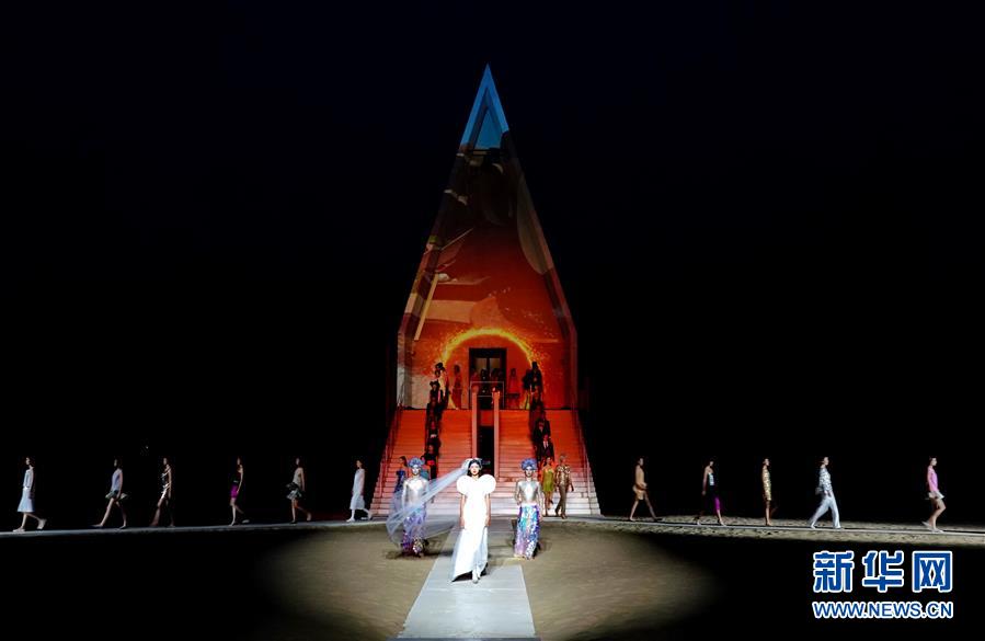 9月5日,模特在展示皮尔·卡丹时装。 当日,皮尔·卡丹2020春夏大型时装发布会在河北省秦皇岛市北戴河新区阿那亚沙滩举行。 新华社记者 杨世尧 摄