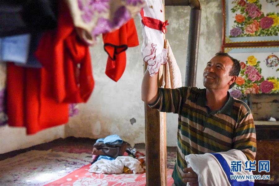新疆喀什地区叶城县棋盘乡尤喀克吾让村村民阿拜克力·海力帕提在收拾衣物,为搬迁做准备(8月18日摄)。