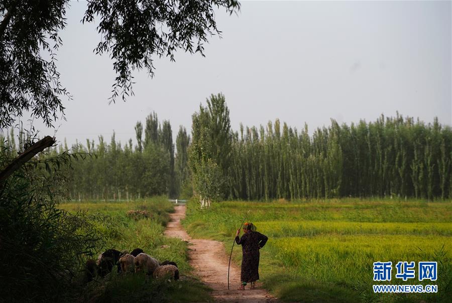 9月1日,在喀什市帕哈太克里乡,一名村民在稻田边放羊。 新疆喀什市帕哈太克里乡地处塔克拉玛干沙漠边缘,乡外两河环绕,乡间稻田广布,是远近闻名的稻米产地。近年来,当地依托水稻资源优势,升级稻米产品,打造高端产品。此外,还通过村容村貌整治、引进农耕文化元素、升级田园风光等措施,推动农旅结合,打造出拥有小桥流水与传统民居的“江南水乡”,当地村民在“水乡”民宿、餐饮等岗位实现就业,实现脱贫增收。 新华社记者 陈君清 摄