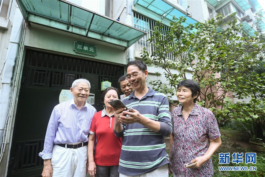 9月6日,杨福根在小区楼下跟邻居们展示刚制作的一款表情,这些老街坊邻居都是他的表情包的忠实粉丝。新华社记者翁忻旸摄