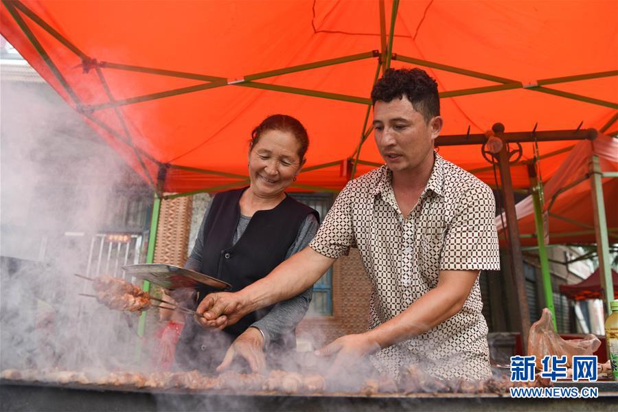 新疆喀什地区英吉沙县依格孜牙乡居民古丽罕·胡达拜尔迪(左)和儿子在烤肉(8月13日摄)。