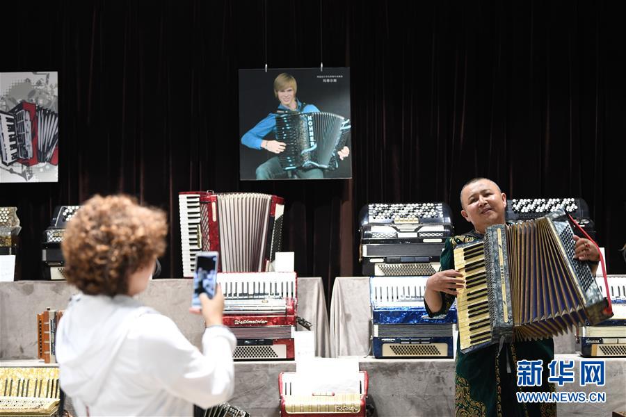 9月4日,游客在新疆塔城市手风琴博物馆内观看博物馆手风琴演奏老师道吾然·对山汉演奏。 塔城市手风琴博物馆位于塔城群众文化宫三楼,总面积500平方米。展馆收藏有中国、俄罗斯、德国、意大利、乌克兰等10个国家的900余架手风琴,涵盖百乐、东方红、火炬、星海等十多个品牌。手风琴已经成为塔城一张亮丽的名片,充分展示了独具塔城特色的文化,塔城市也被老百姓称为“手风琴之城”。 新华社记者沙达提摄