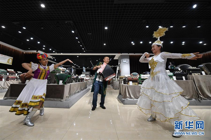 9月4日,在新疆塔城市手风琴博物馆内,博物馆手风琴演奏老师道吾然·对山汉(中)演奏手风琴。 塔城市手风琴博物馆位于塔城群众文化宫三楼,总面积500平方米。展馆收藏有中国、俄罗斯、德国、意大利、乌克兰等10个国家的900余架手风琴,涵盖百乐、东方红、火炬、星海等十多个品牌。手风琴已经成为塔城一张亮丽的名片,充分展示了独具塔城特色的文化,塔城市也被老百姓称为“手风琴之城”。 新华社记者沙达提摄
