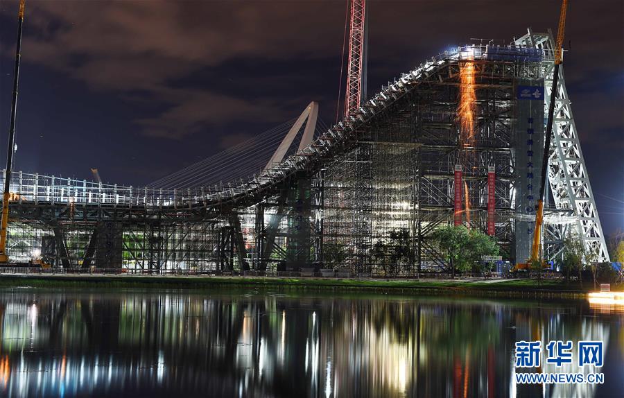 这是8月29日晚拍摄的首钢园区内在建设的首钢滑雪大跳台。 新华社发(王京广 摄)