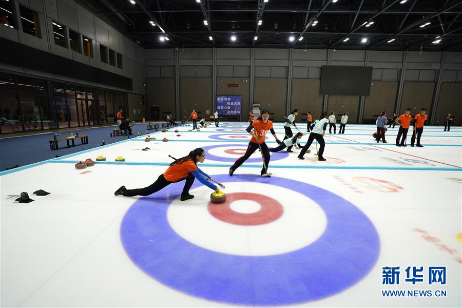 国家冰壶集训队选材训练营的运动员在位于首钢园区的冰壶训练馆进行训练(2018年7月27日摄)。 新华社记者鞠焕宗摄
