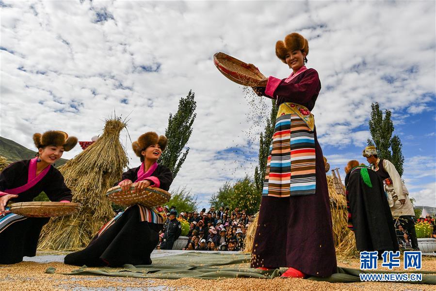 9月6日,当地演员在2019·西藏“中国农民丰收节”暨扎囊氆氇文化节开幕式上再现青稞丰收场景。 当日,2019·西藏“中国农民丰收节”暨扎囊氆氇文化节在西藏山南市扎囊县举行,节日将持续四天。 新华社记者 张汝锋 摄