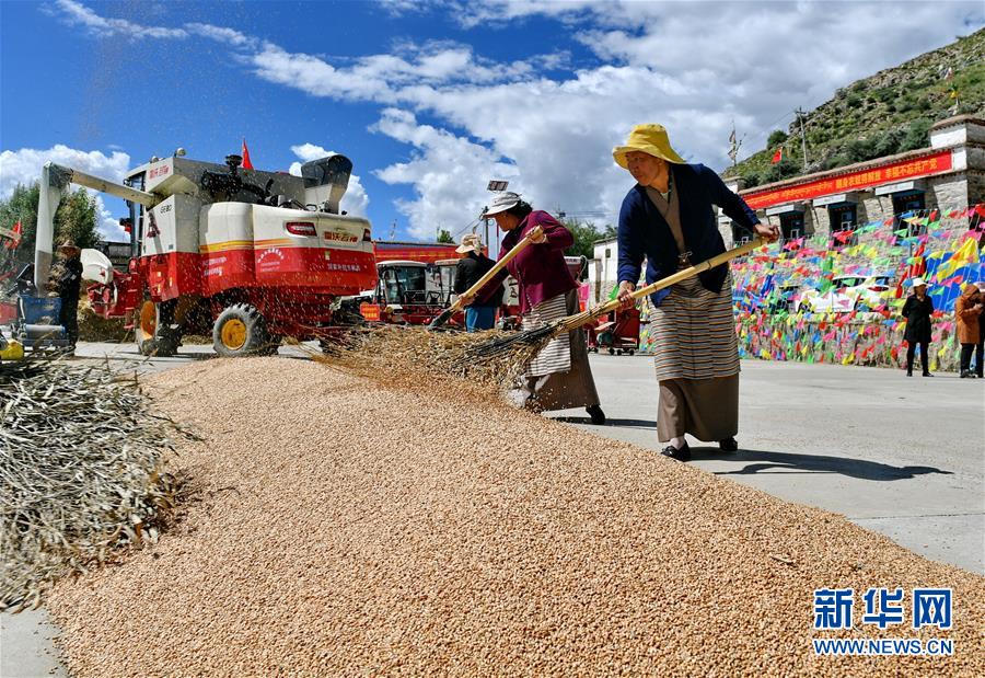 9月6日,在2019·西藏“中国农民丰收节”暨扎囊氆氇文化节上,扎囊县羊嘎居委会群众在进行秋收。 当日,2019·西藏“中国农民丰收节”暨扎囊氆氇文化节在西藏山南市扎囊县举行,节日将持续四天。 新华社记者 张汝锋 摄