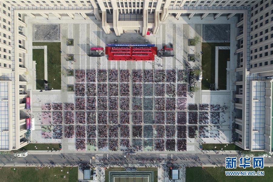 开学典礼现场(9月7日无人机拍摄)。 当日,西安交通大学举行2019级研究生开学典礼,7000余名硕士、博士研究生新生在该校新投入使用的中国西部科技创新港参加活动。 新华社记者 邵瑞 摄