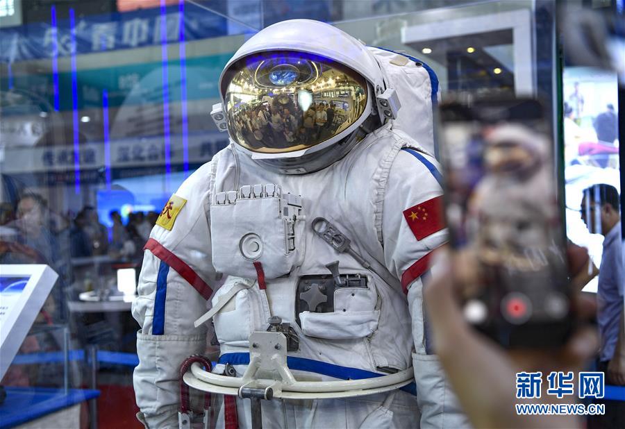 9月7日,在第四届中国-阿拉伯国家博览会高新技术与装备展上,观众在观看舱外航天服。新华社记者 冯开华 摄