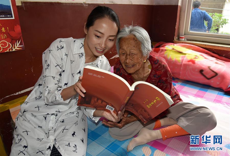 查娇娇(左)在乳娘家乡采风时探望乳娘王葵敏,与王葵敏一同翻阅有关胶东育儿所的史料(6月20日摄)。新华社记者 王凯 摄