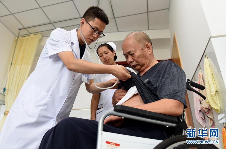 9月7日,南和县中医院医养中心医护人员为老人检查身体。新华社记者 朱旭东 摄