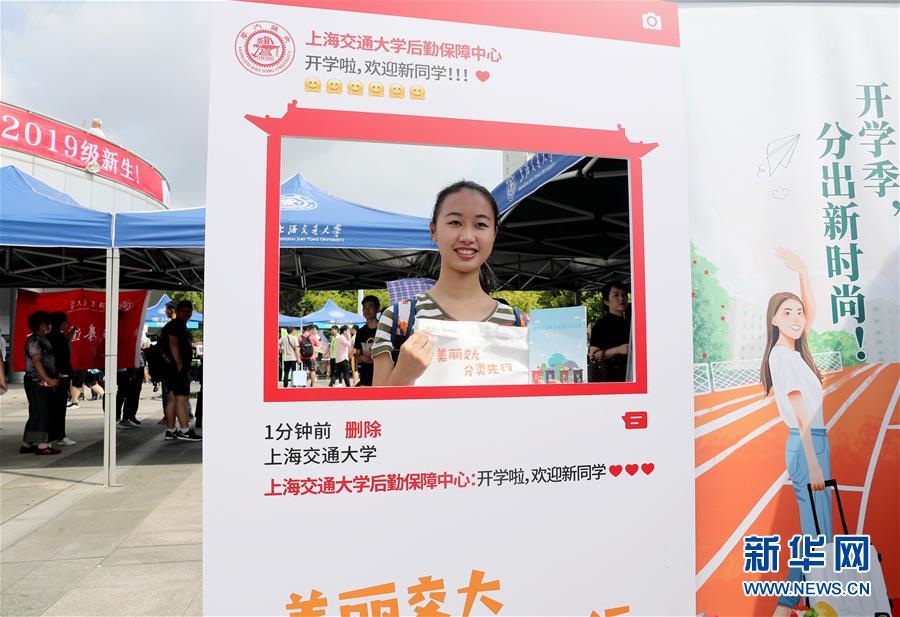 9月7日,新生在领取垃圾分类知识手册和环保袋后拍照留念。新华社记者 刘颖 摄