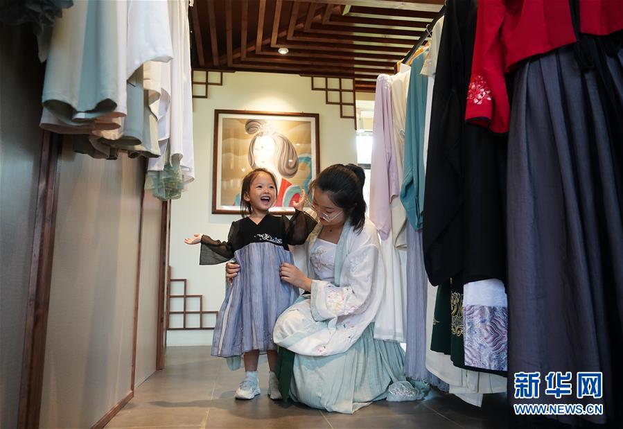 9月7日,在金陵水乡钱家渡游客服务中心,工作人员帮助一名小朋友体验汉服。新华社记者 季春鹏 摄