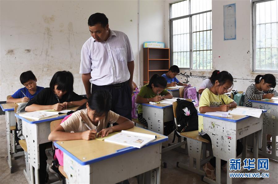 韦国际在田东县作登瑶族乡驮瓜村小学的教室里指导学生们写作业(9月3日摄)。 新华社记者 曹祎铭 摄