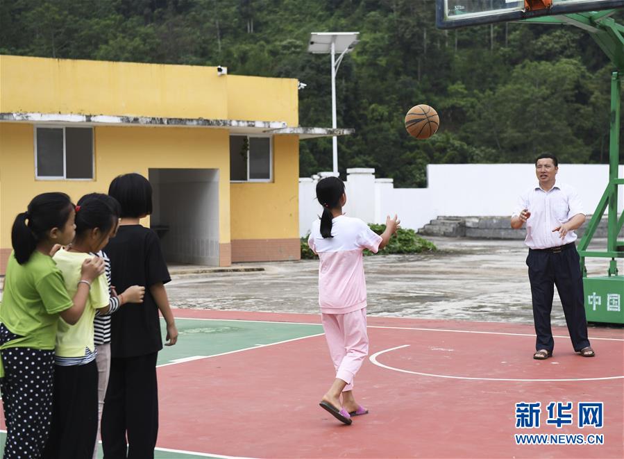 韦国际(右一)在田东县作登瑶族乡驮瓜村小学里与学生们玩篮球(9月3日摄)。 新华社记者 曹祎铭 摄