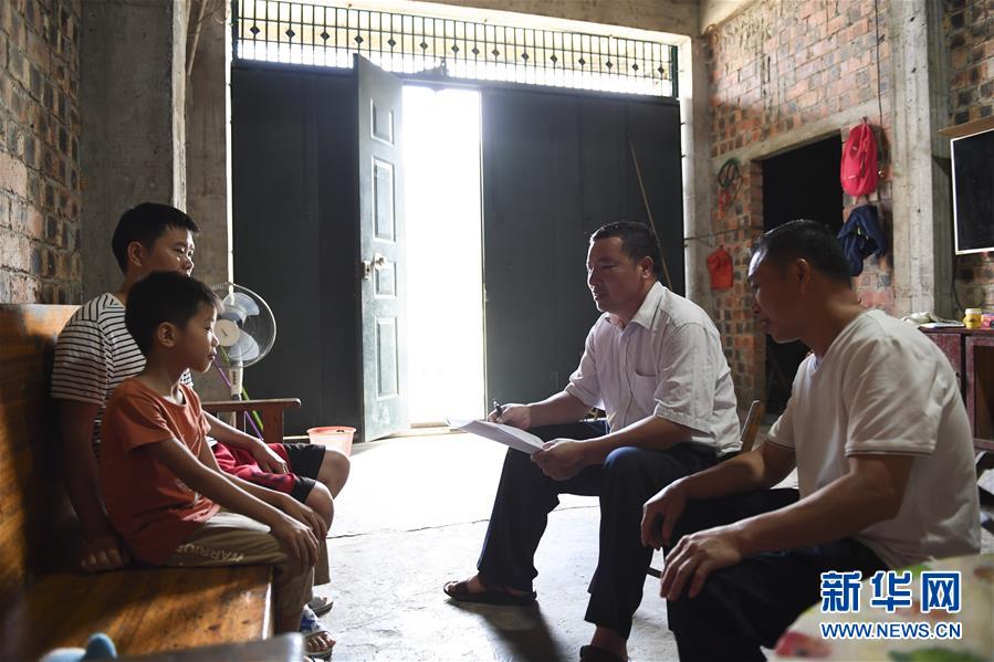 韦国际(右二)与另一位学校老师(右一)一起在学生家里家访(9月3日摄)。 新华社记者 曹祎铭 摄