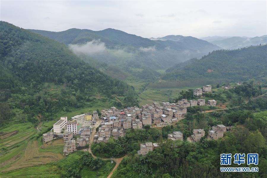 这是9月3日无人机拍摄的坐落在大山深处的田东县作登瑶族乡驮瓜村小学(左侧建筑)和驮瓜村。 新华社记者 曹祎铭 摄