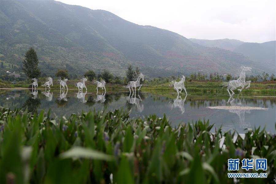 这是在云南省大理白族自治州洱源县凤羽镇拍摄的、佛堂村村民周正昌用白色铁丝编制的8匹骏马(9月3日摄)。 新华社记者 王安浩维 摄