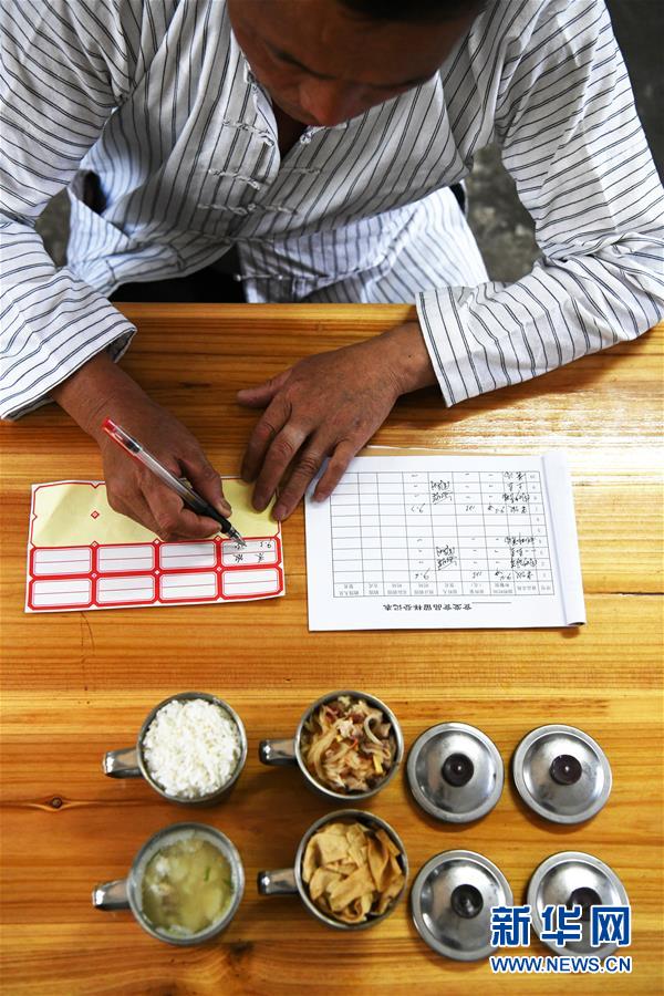 姜同英为学生们的营养午餐作留样登记(9月5日摄)。 新华社记者 杨文斌 摄