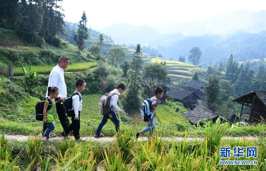 姜同英护送学生放学回家途中(9月5日摄)。 新华社记者 杨文斌 摄