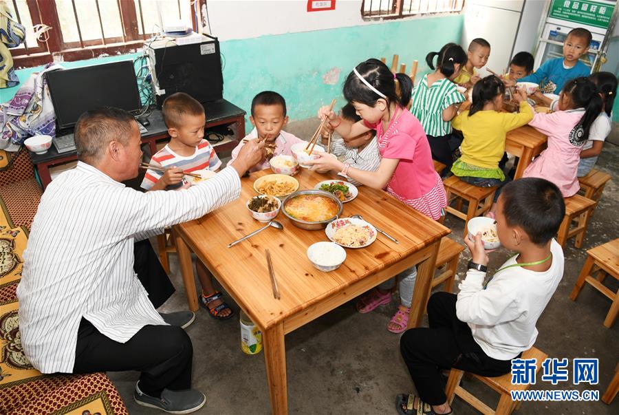 姜同英跟学生一起吃午餐(9月6日摄)。 新华社记者 杨文斌 摄