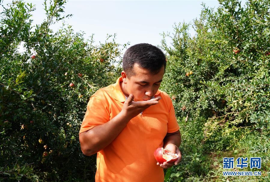 8月31日,在新疆喀什市伯什克然木乡叶汗里村,艾力江在自家的石榴园里品尝石榴。 新华社记者 陈君清 摄