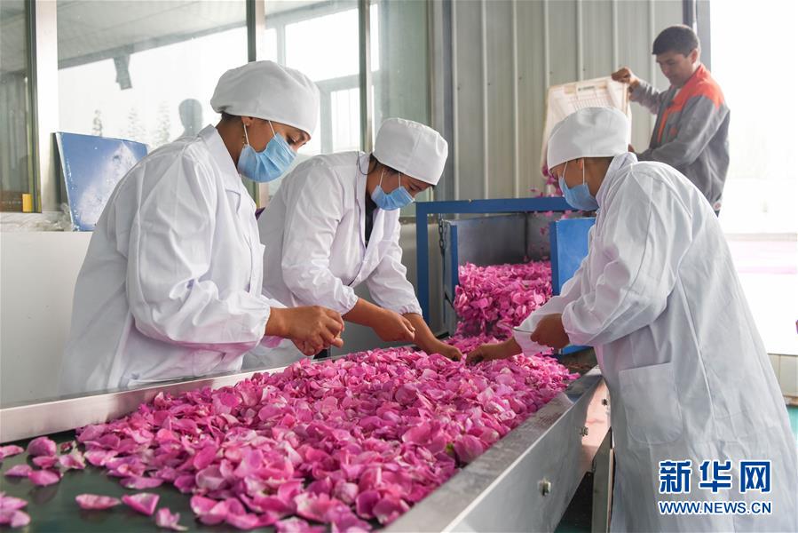 在新疆和田地区于田县一家特色农业农民合作社,工人们在分拣刚摘的玫瑰花(9月3日摄)。 新华社记者 丁磊 摄