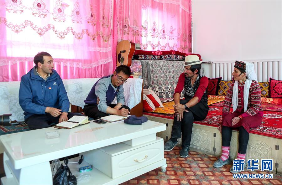 达布达尔乡乡长高波(左二)、热斯喀木村党支部书记塔夏·买买热依木(左一)在村民家中走访(7月6日摄)。 新华社记者 李京 摄