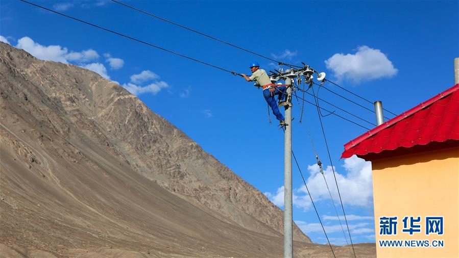 施工人员在新疆塔什库尔干塔吉克自治县达布达尔乡热斯喀木村架设入户电线(7月6日摄)。 新华社记者 李京 摄