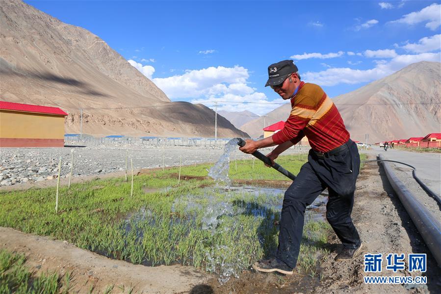 新疆塔什库尔干塔吉克自治县达布达尔乡热斯喀木村村民在灌溉(7月7日摄)。 新华社记者 李京 摄