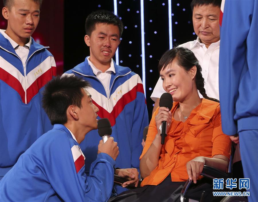 2012年9月4日,张丽莉老师和她的学生在中央电视台教师节晚会录制现场。张丽莉是黑龙江省佳木斯市第十九中学教师,在2012年5月8日的一次交通事故中,她为救学生而受重伤,致使双腿截肢。新华社记者 丁林 摄