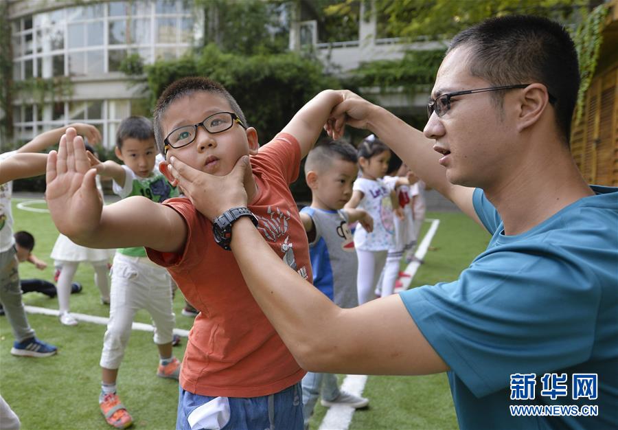 2015年9月8日,在南京市第一幼儿园,男幼师傅纬在教孩子们武术操。傅纬2011年从南京师范大学体育系毕业后来到幼儿园工作。新华社记者 季春鹏 摄
