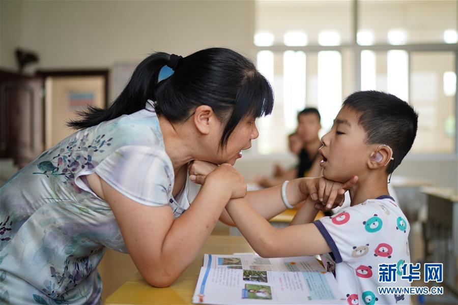 2019年7月3日,在江西萍乡芦溪县特殊教育学校,刘小清老师握着学生的手贴在自己的咽部让他感受发声。刘小清老师说:“我教的孩子没有进入名校的,更没有成名的,但能让他们坚定生活信心、告别自卑,能像正常人一样顺利成家立业,我就最高兴。”新华社记者 周密 摄