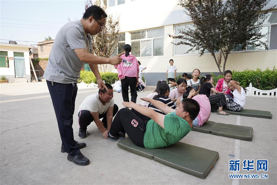 9月5日,赵文波(左一)在给学生上体育课。新华社记者 邢广利 摄