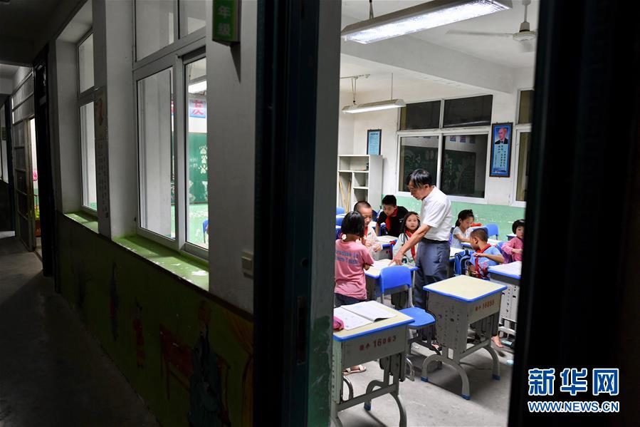 夜晚,西津畲族小学校长庄桂淦在辅导三年级孩子上晚自习(9月3日摄)。新华社记者姜克红摄