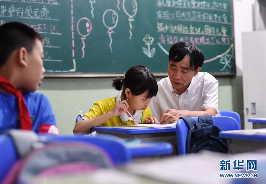 夜晚,庄桂淦(右一)在给五年级学生杨诗诗辅导作业(9月3日摄)。新华社记者林善传摄