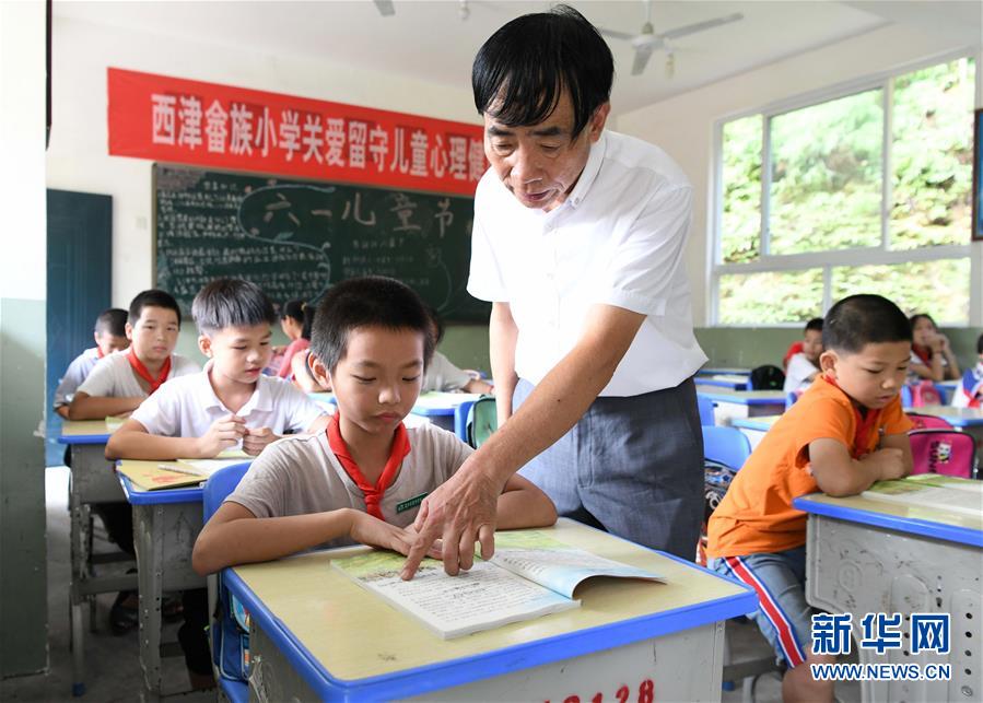 西津畲族小学校长庄桂淦在教室辅导孩子们上早自习(9月4日摄)。新华社记者姜克红摄