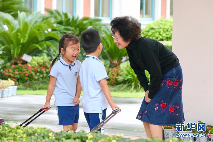 清晨,封莉容在上海宋庆龄学校迎接走进校园的学生(9月3日摄)。 封莉容是上海宋庆龄学校的校长、宋庆龄幼儿园名誉园长。18岁入党,从教39年,谈起孩子总是充满热情、神采奕奕,她觉得,自己“骨子里就是当教师的料”。 近日,封莉容获评2019年全国教书育人楷模。又一个荣誉称号让封莉容备受鼓舞,而她最“宝贝”的“头衔”,依然是学生们一声声喊出的“封老师”。 新华社发