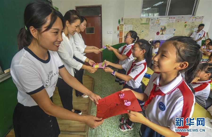 9月9日,廊坊市第二十三小学的学生将自己制作的贺卡送给老师。新华社记者 李晓果 摄