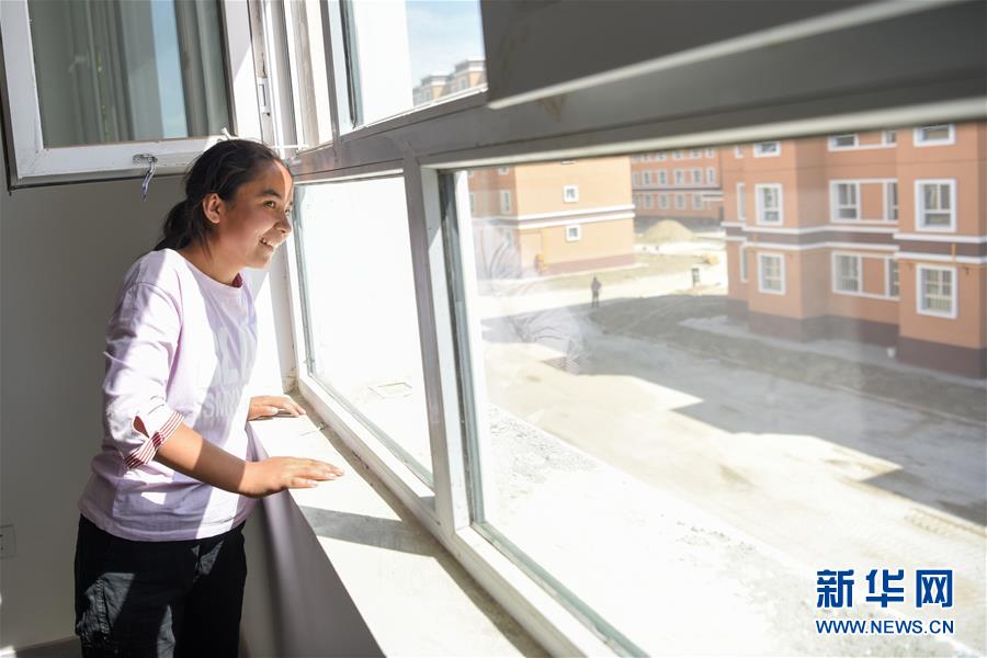 古丽孜巴·阿拜克力在将要搬入的新居中望向窗外(8月19日摄)。新华社记者 丁磊 摄
