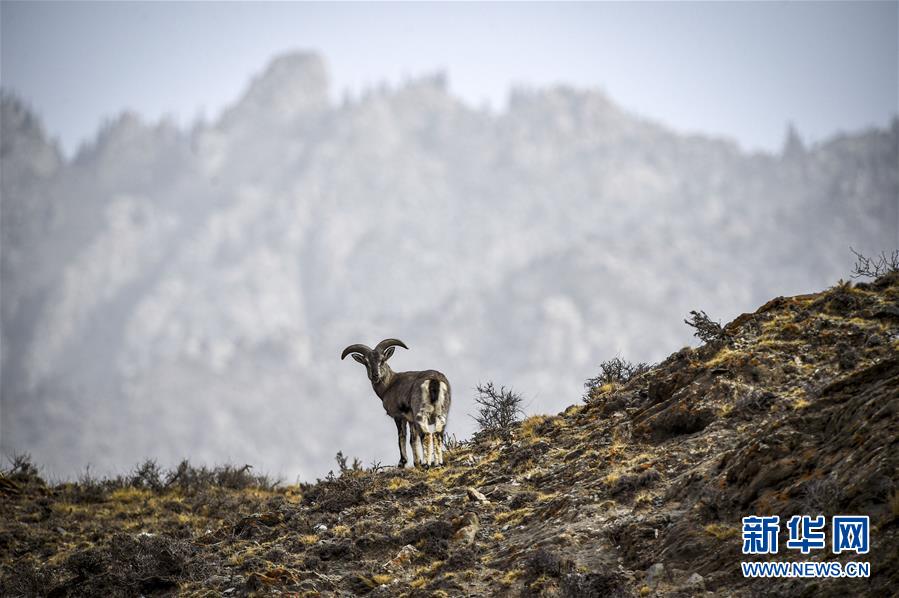 在宁夏回族自治区贺兰山国家级自然保护区内,一只岩羊站立在峭壁上(3月27日摄)。新华社记者 冯开华 摄
