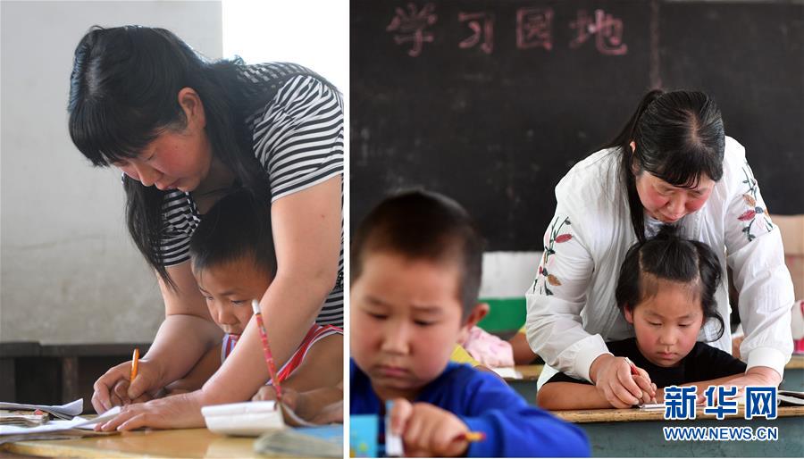 左图:2011年6月15日,河南省平顶山市鲁山县霍庄小学老师霍建芳在教室里辅导学生。新华社记者赵鹏摄;右图:2019年9月5日,河南省平顶山市鲁山县尧山镇第五中心小学霍庄教学点(原名霍庄小学)的霍建芳老师在课堂上辅导学生。新华社记者李嘉南摄 今年50岁的霍建芳老师在河南省平顶山市鲁山县尧山镇第五中心小学霍庄教学点(原名霍庄小学)做了34年老师。有人曾这样称赞霍建芳:尽管她去过最远的地方只是县城,可她却给了深山里的孩子一把开启世界的钥匙。 8年后,当新华社记者拿着2011年的老照片再次来到群山环绕的尧山镇,找到霍老师时她正在给学生上课。看到老照片,不善言谈的霍建芳腼腆一笑:“可不好意思,又麻烦你们跑一趟。” 1985年,16岁的霍建芳从鲁山县尧山镇中学毕业后回到家乡大山深处的小学执教。教学点地理位置偏僻,大多数时候这里只有她一名老师。现在有16个孩子在这里上学,分为两个年级和一个学前班。霍老师所教的学生绝大部分都是留守儿童,霍建芳既是孩子们的老师,也是孩子们的“妈妈”。 霍建芳也不是没有打过退堂鼓。“父母岁数大了,我也照顾不到”,说到自己的父母霍老师突然哽咽了,可是她依然选择留下。霍建芳说,“许多人都说农村教师苦。但是只要你用心爱学生,勇于承担你的责任,你就会发现人生的价值。” 教师节前夕,新华社播发了新媒体稿件《我和我的老师:寻找照片中的你》。五张老照片中,有20世纪50年代的高中物理老师,也有近年来坚守在深山里的乡村小学教师。“寻找”稿件播发后受到读者关注,一些热心读者打来电话或发邮件提供线索、讲述老师的故事。目前回访到的是:河南省鲁山县霍庄教学点霍建芳老师,山西省宁武县硫磺沟小学李月娥老师,上海市育才中学已故陆锦容老师的儿子。 “为学莫重于尊师。”今天是第35个教师节,向人民教师道一声:老师辛苦了! 新华社发
