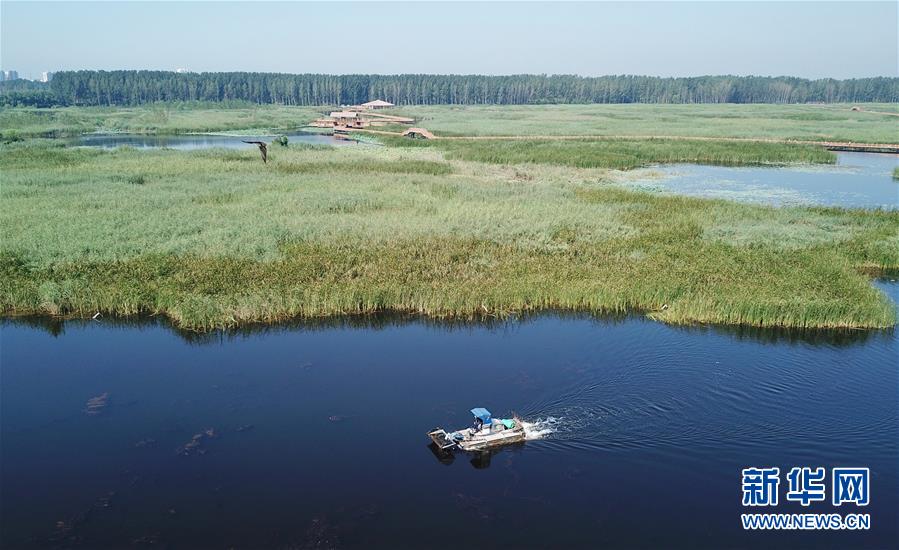 这是一艘打捞船在白洋淀景区内清理漂浮物(8月31日无人机拍摄)。 新华社记者 牟宇 摄