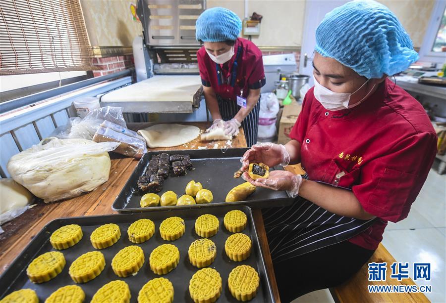 9月10日,永清县“桂香园”店员在制作手工月饼。 新华社记者 李晓果 摄