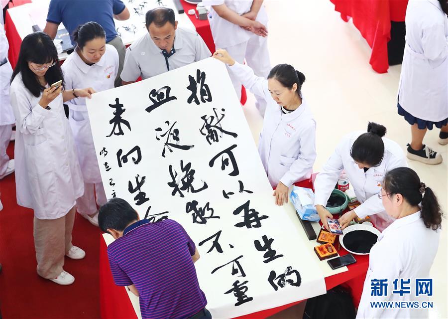 9月10日,北京市红十字血液中心工作人员在活动现场观看书法作品的创作过程。新华社记者 张玉薇 摄